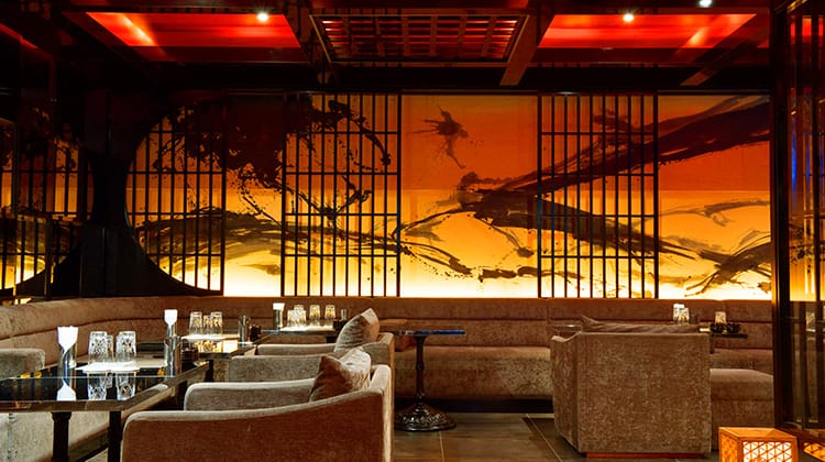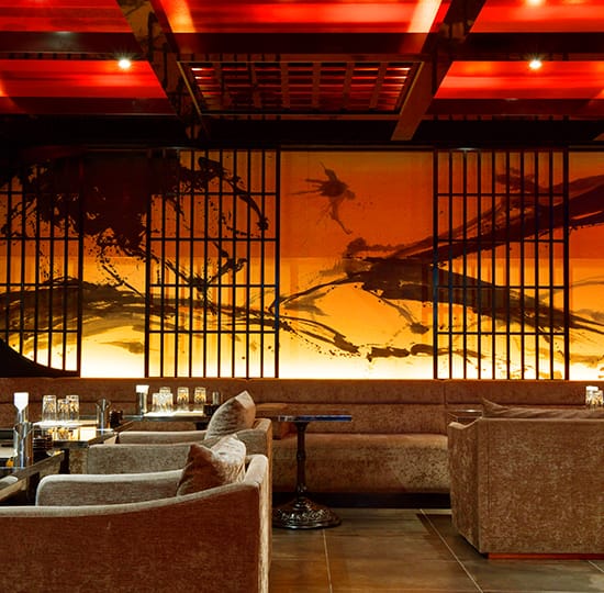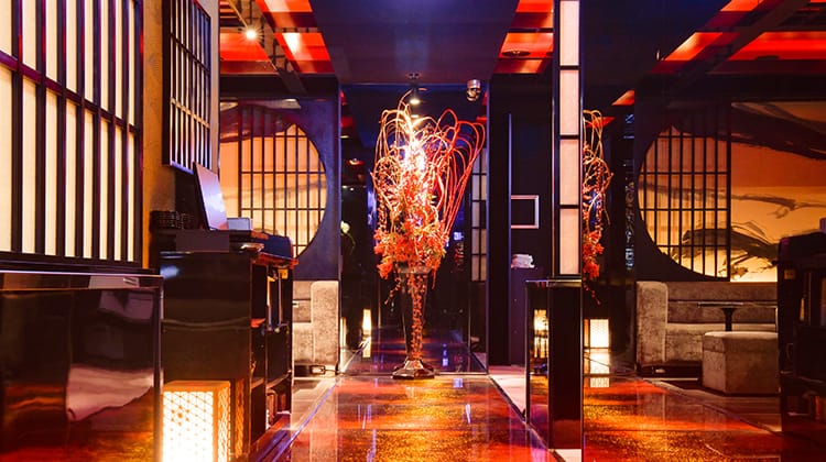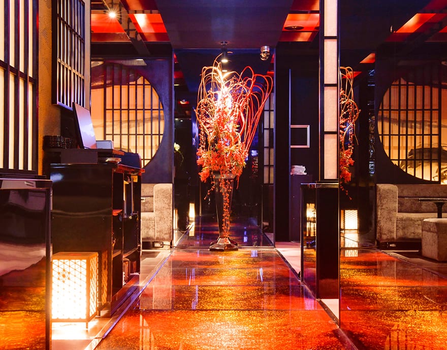 一面に敷かれた真紅の和紙が、非日常な空間へと誘います。